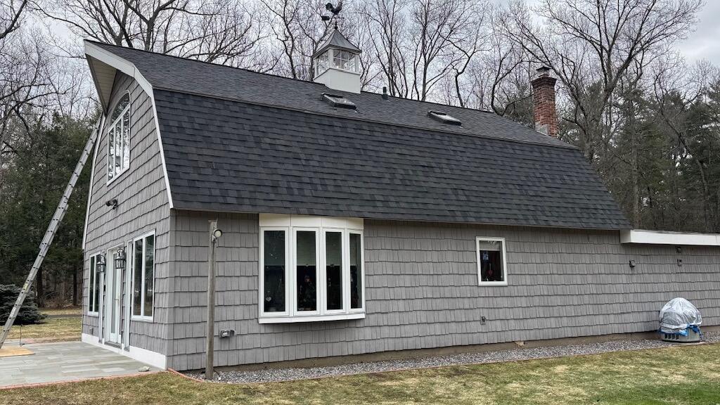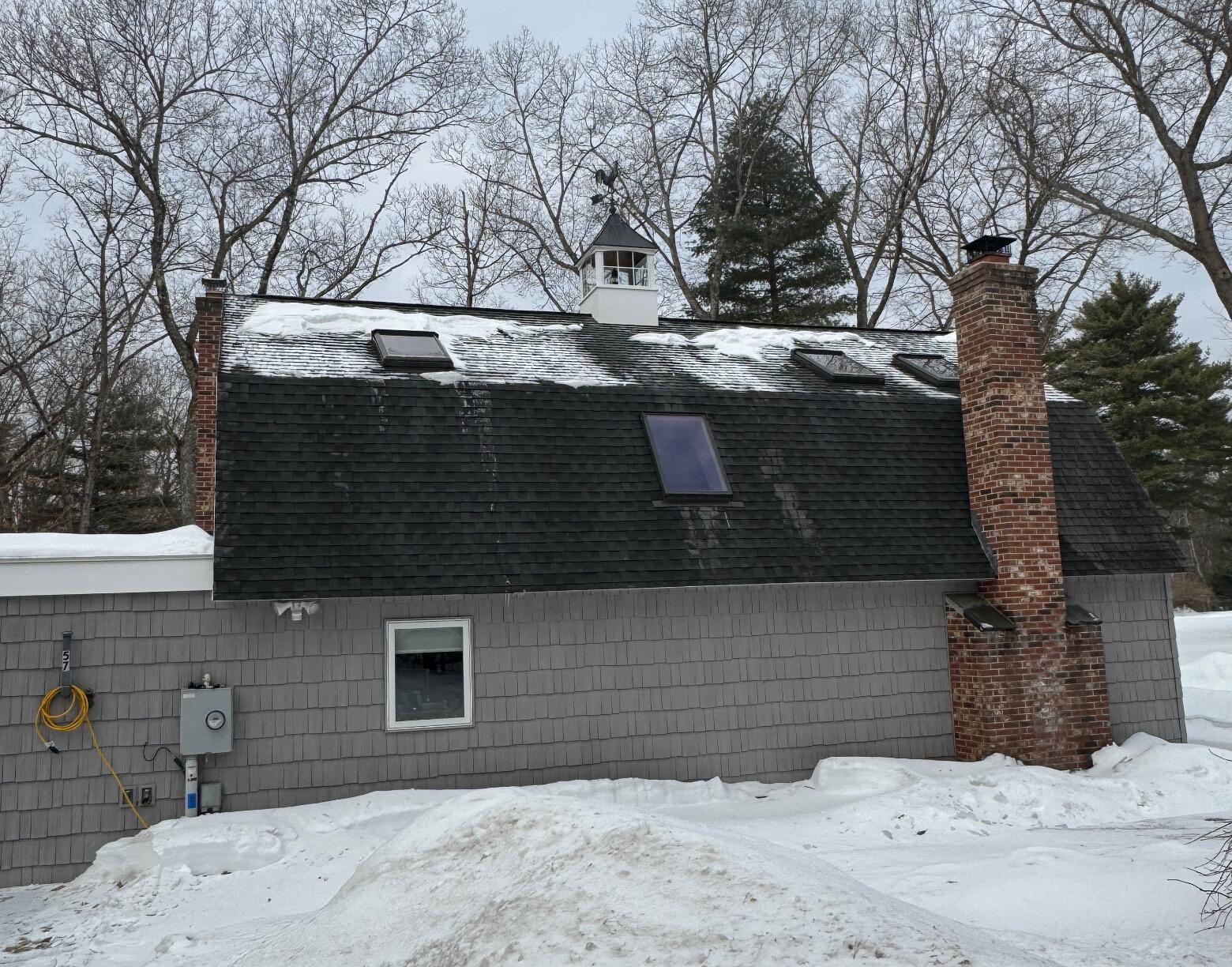 Our team removed the existing roofing system and rebuilt the roof to better handle New England weather. A key part of the project was addressing the skylights, where we reflashed all six existing skylights to ensure they were properly sealed and protected against future leaks. Once everything was prepped and secured, we finished the roof with IKO Dynasty shingles in the color Glacier, giving the home a clean, refreshed look.
