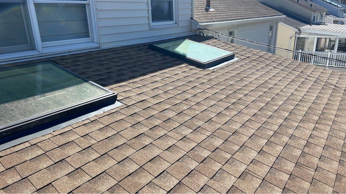 A homeowner from Hicksville called because a leak was found in the ceiling from one of the skylight windows. Our Klaus representative performed a thorough inspection and an itemized proposal was issued for repair to the skylight roof area. The Klaus Roofing Team removed the old, cracked shingles and damaged plywood, then sealed the skylight window, layered copper flashing and replaced the roof with new plywood. Next the seams of the plywood were taped, and all the Klaus exclusive underlayers were applied to the roof deck. Lastly, the shingles were nailed down with ring shank galvanized nails. The homeowner will now feel confident in all weather and safe under the new Klaus roof.