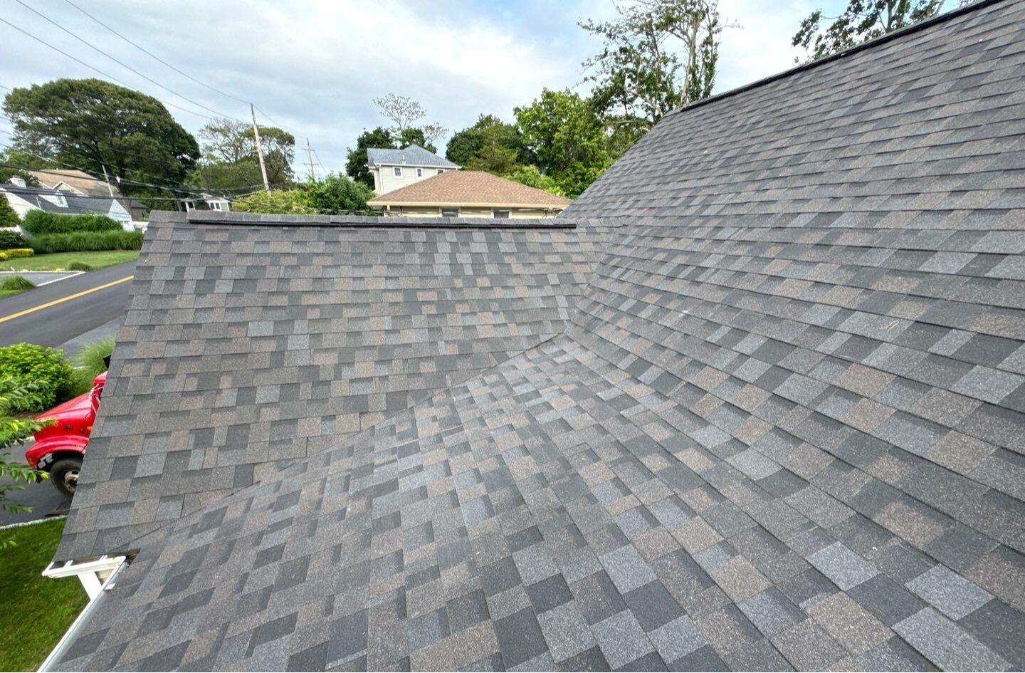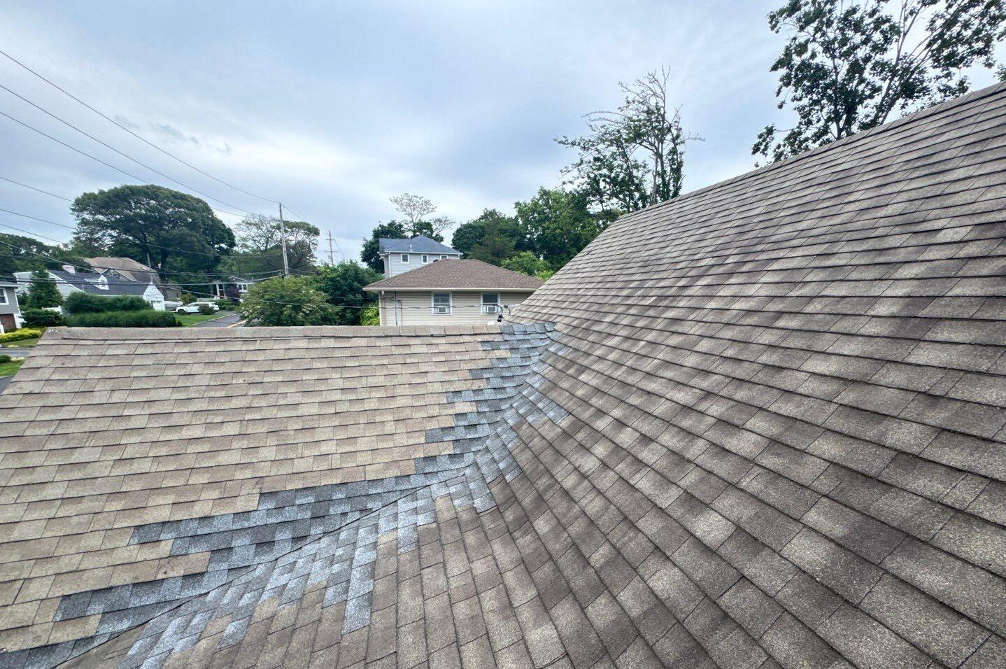 A homeowner from Huntington called after having discovered roof leaks during rainstorms. Our representative Ryan visited and performed a free roof inspection and discovered old, cracked shingles, rusted nail holes penetrating into the attic, and wet and rotting wood near the edges of the roof gutters causing water to leak into the attic. Ryan provided an itemized proposal to the homeowner and scheduled a roof replacement. The Klaus Roofing Systems team arrived on the day of installation and covered the surrounding area with tarps to protect the home and landscaped area. The team then removed all pre-existing shingles and rotted wood, replaced with new plywood, then applied a fully-adhered membrane six feet from the eave for added protection. Next all the seams were taped and the roof deck covered with a synthetic underlayment. A metal rake edge and drip edge were added as an extra layer of protection and then the roof was finished with purpose-made shingles. The homeowner now has a multi-layered installation process that goes beyond standard roofing. The Klaus Roofing System gives customers the confidence that their home is well-protected against heavy rain, high winds, and winter weather for decades to come.