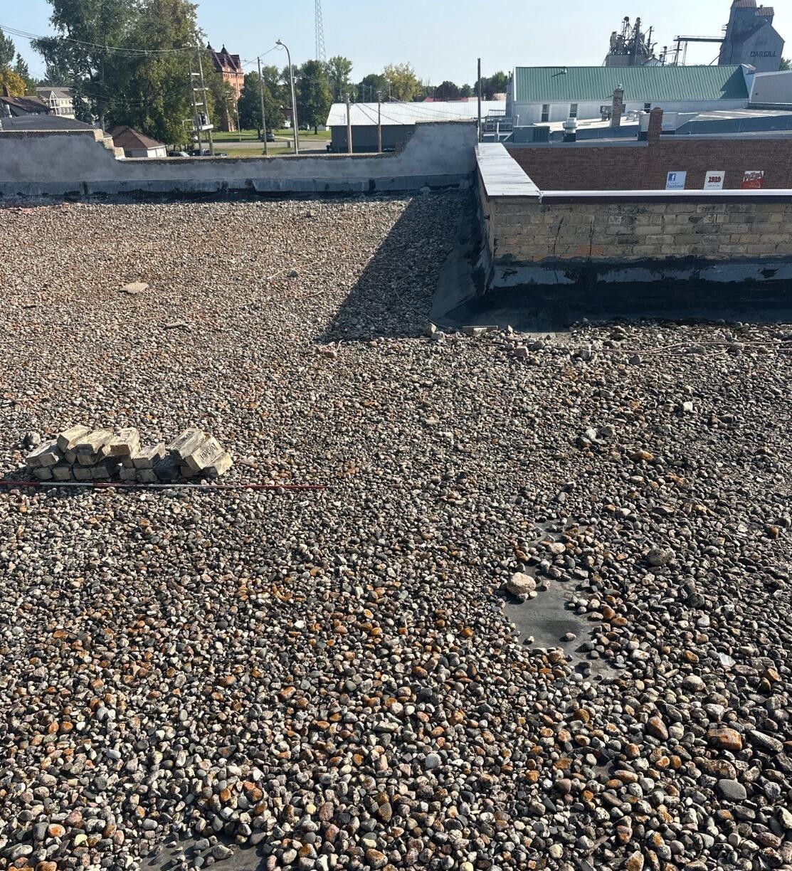 Property owner Rodney in Ada, MN, called Vita Roofing after repeated leaks began interrupting business operations. The roof had been badly damaged by years of severe weather, and standing water could be seen in multiple areas after every rainstorm. The existing roof system consisted of a loose rock-covered EPDM roof with an older modified bitumen and tar roof hidden underneath. By the time Vita Roofing completed its detailed inspection, it was clear that patching the roof would only be a temporary fix.