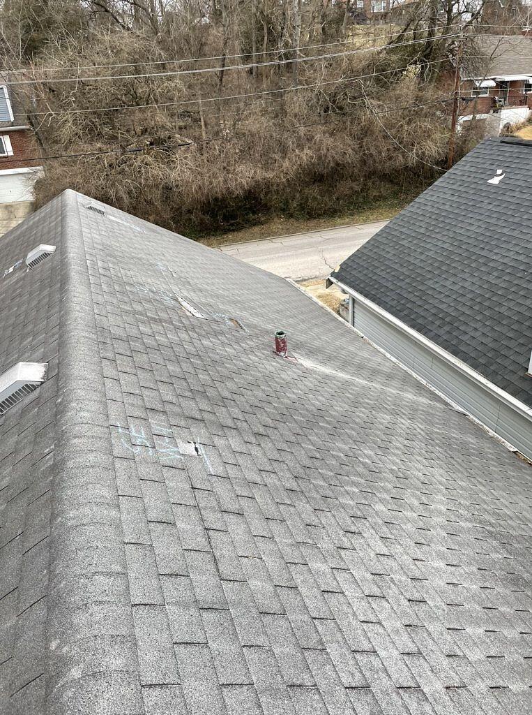 This roof in Bellevue, KY, had experienced some pretty concerning wind damage over the years. Our Inspector, Kyle, was able to count up to nine missing shingles. We worked with the homeowners insurance company to receive a proper claim by taking accurate photos and meeting with the adjusters at the home. After receiving the insurance claim, we then got to work on replacing the roof. We also added our RainDrop gutter guards to help protect the gutter system. The result was a happy homeowner who can now look forward to years of protection.