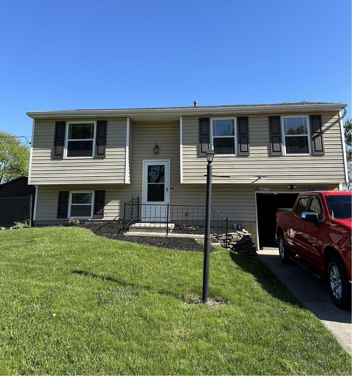 We removed all of the old siding, installed a new vapor barrier, and replaced it with durable EXP vinyl siding (slate colored) across the entire home. We also updated the front façade with new cathedral-top vinyl shutters (white colored) and made structural repairs to fascia and rafter ends where needed. The new look isn’t just cosmetic, it’s built to last and adds real value to the property.