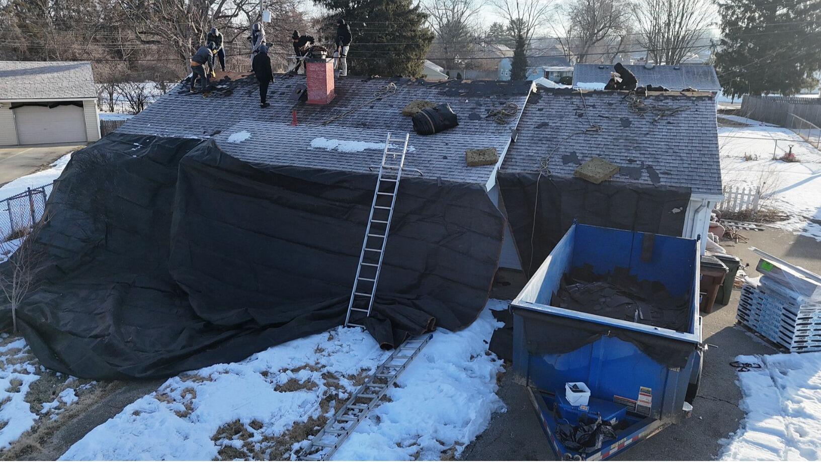 The owner of this home in Fairborn, OH, had an active leak coming from their aged roof. Within days, we sent an Inspector out to the home to give an estimate on replacing the worn down roof. A couple of days after that, we replaced the roof entirely with premium asphalt shingles in the Atlantic Blue colorway. As seen in the before photo, our crew tarped around the edge of the roof to ensure that we collected all the debris when tearing off the existing roof. This is especially helpful when there is a large amount of snow on the ground. This project goes to show how quickly we can repair a roof in a slower time of the year.